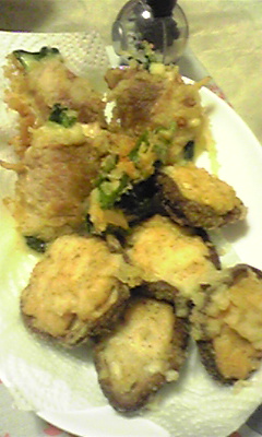 もう一皿は 下:椎茸に鶏ミンチ詰めたやつ 上:豚でチーズとほうれん草巻いたやつ。